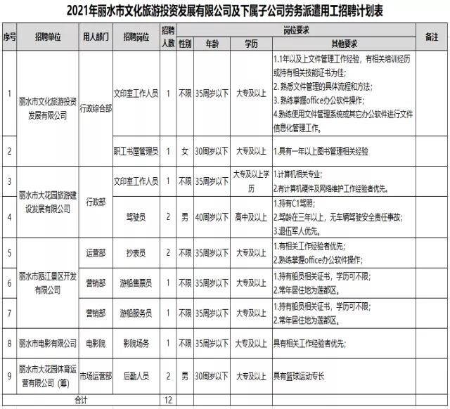 因工作需要,麗水市文化旅游投資發(fā)展集團(tuán)有限公司公開招錄文印室工作人員等崗位人員12名,由麗水市人力資源服務(wù)中心派遣,現(xiàn)將有關(guān)事項(xiàng)公告如下: